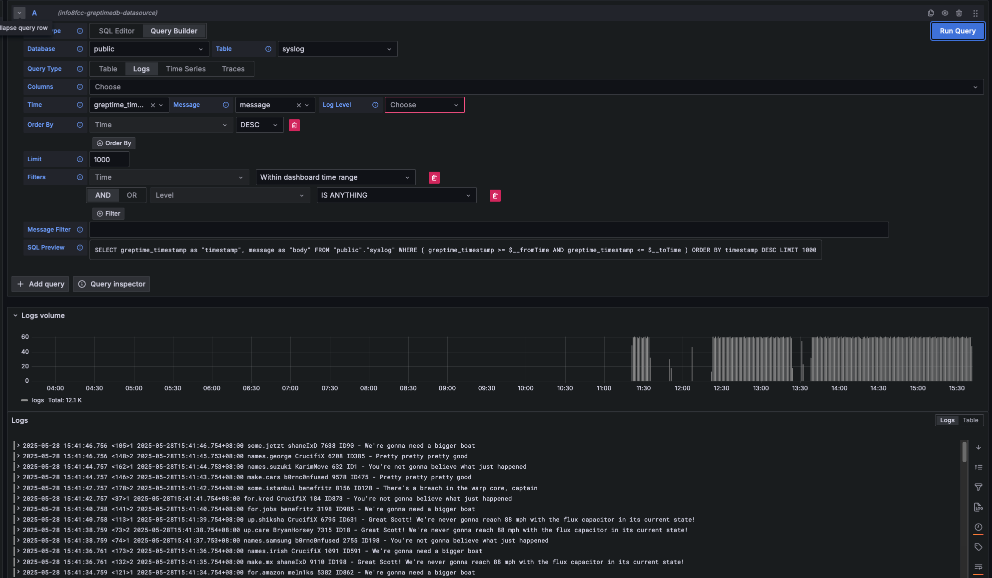 Choose the Logs query type when you want to query log data. You'll need to specify a Time column and a Message column.